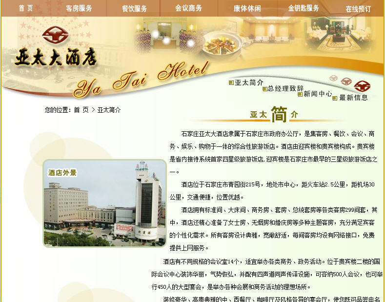 石家莊亞太大酒店隸屬于石家莊市政府辦公廳,是集客房、餐飲、會議、商務、娛樂、購物于一體的綜合性旅游飯店。酒店由迎賓樓和貴賓樓構(gòu)成。貴賓樓是省內(nèi)接待系統(tǒng)首家四星級旅游飯店,迎賓樓是石家莊市最早的三星級旅游飯店之一。