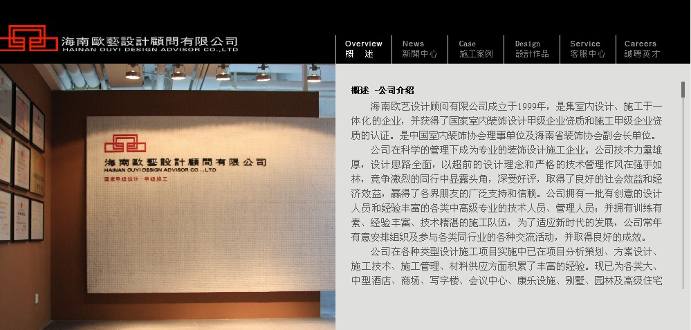 海南歐藝設計顧問有限公司成立于1999年,是集室內(nèi)設計、施工于一體化的企業(yè),并獲得了國家室內(nèi)裝飾設計甲級企業(yè),并獲得了國家室內(nèi)裝飾設計甲級企業(yè)資質(zhì)和施工甲級企業(yè)資質(zhì)的認證。是中國室內(nèi)裝飾協(xié)會理事單位及海南省裝飾協(xié)會副會長單位。