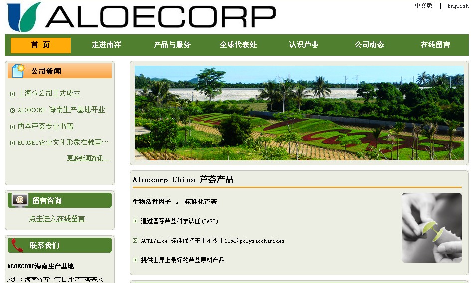 已故的Econet集團(tuán)創(chuàng)始人李然浩先生于1988年來(lái)到美國(guó)德州買(mǎi)下了Hiltontop Gardens并建立美國(guó)公司。從此Aloecorp開(kāi)始了蘆薈的大規(guī)模標(biāo)準(zhǔn)化種植和加工。自從公司設(shè)立以來(lái)來(lái),Aloecorp投入了大量的資金和人力進(jìn)行生產(chǎn)工藝的改善、產(chǎn)品質(zhì)量的提升和蘆薈科學(xué)實(shí)驗(yàn)和研究。