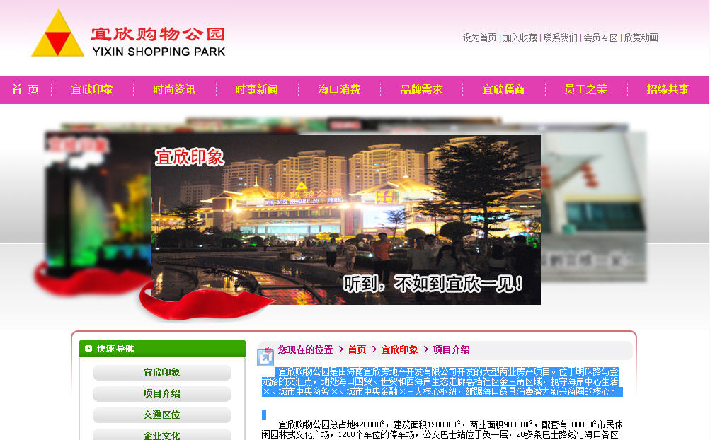 宜欣購物公園是由海南宜欣房地產(chǎn)開發(fā)有限公司開發(fā)的大型商業(yè)房產(chǎn)項(xiàng)目。位于明珠路與金龍路的交匯點(diǎn),地處??趪Q(mào)、世貿(mào)和西海岸生態(tài)走廊高檔社區(qū)金三角區(qū)域,扼守海岸中心生活區(qū)、城市中央商務(wù)區(qū)、城市中央金融區(qū)三大核心樞紐,雄踞海口最具消費(fèi)潛力新興商圈的核心。